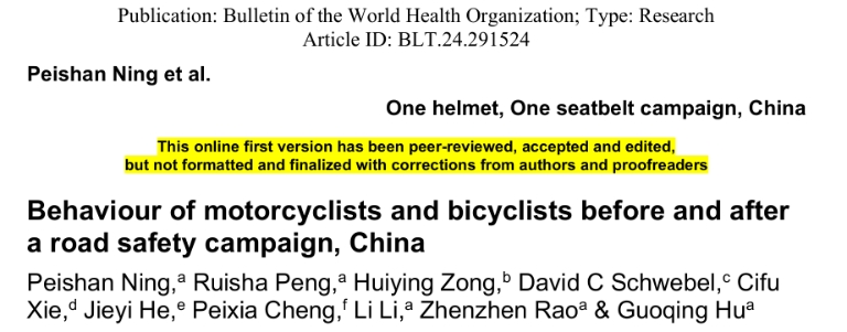 流行病与卫生统计学系胡国清教授团队的最新研究成果“Behaviour of motorcyclists and bicyclists before and after a road safety campaign, China”在国际公共卫生领域权威期刊、世界卫生组织官方期刊《Bulletin of the World Health Organization》(IF=8.4,SCI分区1区,Top 5%期刊)发表。探花视频