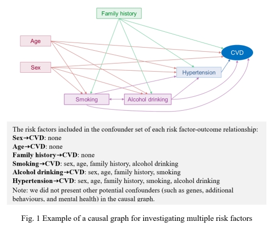 在聚焦单个暴露-结局关联的研究中,根据混杂的三个条件(是结局的影响因素,与暴露有关,并且不是暴露与结局因果链上的中间环节),即可确定需要调整的混杂因素。而在探究多个风险因素的研究中,涉及多个风险因素-结局关联,由于因素之间并非简单的互为混杂的关系,因此不同的风险因素-结局关联可能有不同的混杂因素,而某个风险因素可能在其他危险因素-结局关联中充当混杂或中介或效应修饰变量等。例如在以下研究6个风险因素与CVD关联的例子中,根据混杂的三个条件将每个因素的混杂进行了列举,表明不同的风险因素-结局关联具有不同的混杂集。以其中的家族史-CVD关联为例,吸烟、饮酒和高血压作为中介变量,对这些变量进行调整则会引起过度调整问题,使家族史-CVD关联趋于无效值。