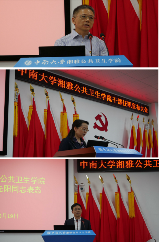 党委书记雷先阳同志表态。雷先阳同志在发言中表示将在上级和学校党组织的正确领导下,不忘教育初心,践行育人使命。在今后的工作中,保持忠诚之心,恪尽职守讲政治;保持上进之心,不辱使命有作为;保持纯洁之心,廉洁自律守规矩。全力同全院职工一道,主动服务于健康中国的国家战略,为建成国家高水平公共卫生学院作出自己的努力。