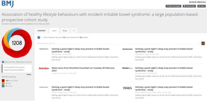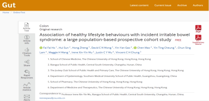 流行病与卫生统计学系吴心音教授团队的研究成果 “Association of healthy lifestyle behaviours with incident irritable bowel syndrome: a large population-based prospective cohort study”。已有包括美国有线电视新闻网(CNN)、英国独立报(The Independent)、卫报(The Guardian)在内的162家新闻媒体报道了该研究。该研究工作由探花视频