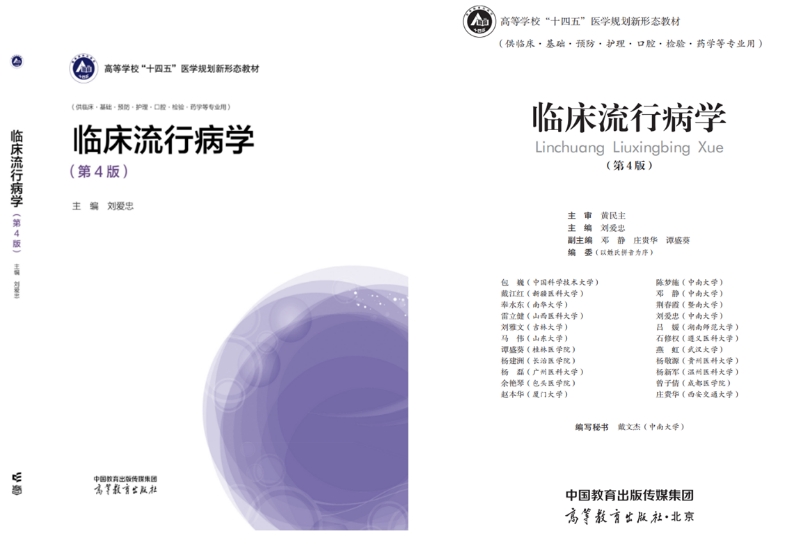 流行病学教研室牵头编写,黄民主教授主审,刘爱忠教授主编、邓静副教授副主编、来自全国20所高校的22位专家教授参编的《临床流行病学》(第4版)于近期由高等教育出版社正式出版。该书是高等学校“十四五”医学规划新形态教材,适用于各医学专业本科生、研究生及临床医生、医学科研人员、卫生管理人员等。