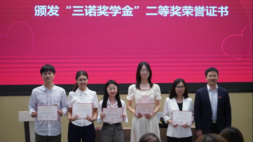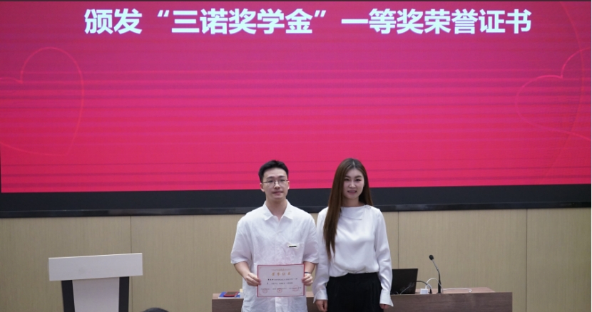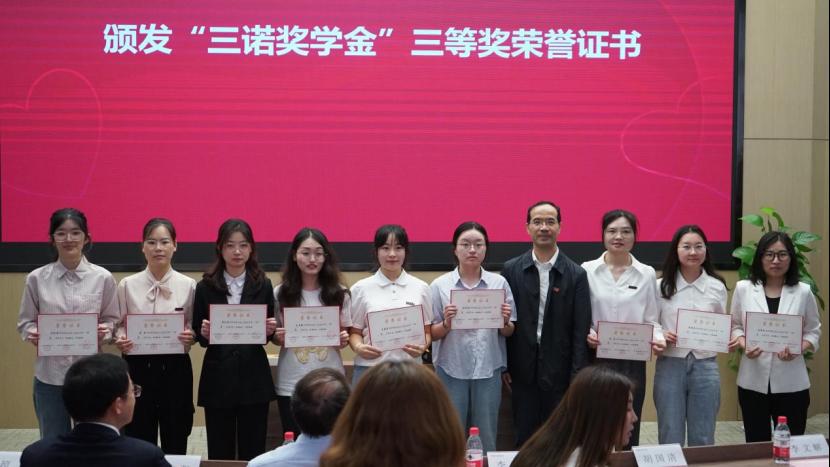 2023-2024学年三诺奖学金的决定”。李心一理事长、雷先阳书记、胡国清院长分别为2024年“三诺奖学金”一等奖、二等奖、三等奖获得者颁发了荣誉证书。韦杰桦、热汗姑丽·买买提土尔逊两位同学作为获奖学生代表,依次分享了自己研究生期间的科研成果和心得体会。刘宪军秘书长在致辞中对三诺生物传感股份有限公司、湖南省三诺糖尿病公益基金会、以及李少波校友、李心一女士长期以来对母校的关心和支持表示衷心感谢;李心一理事长对获奖学生表示祝贺,鼓励他们不忘初心,再接再厉,她以“融爱于生活,融爱于工作”为题发表了热情洋溢的讲话,结合公司“为爱而诺”的探花视频,为同学们今后的职业发展提出了中肯建议,希望同学们在今后的发展中将爱融入生活、将爱融入工作。