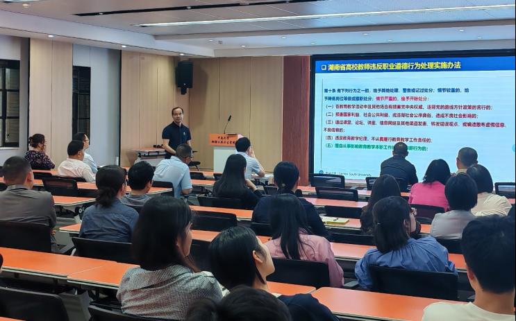 他结合教育部关于高校教师师德失范行为处理的指导意见以及新时代高校教师职业行为十项准则,对全体教职工提出了具体要求,希望大家坚定政治方向、自觉爱国守法、潜心教书育人,以实际行动践行高校教师职业行为准则。针对研究生导师职责与义务,他特别指出,导师是研究生培养的第一责任人,不仅要指导学术研究,更要注重培养学术道德和职业素养,要求导师们坚守政治要求和纪律底线,履行指导义务,尊重学生,科学施教。