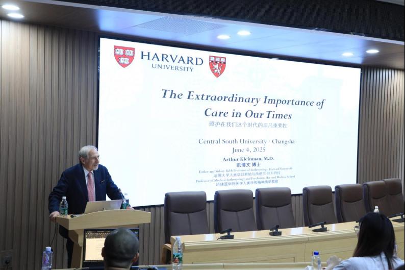 受聘仪式和参观结束后,由湘雅公共卫生学院院长胡国清主持,Arthur Kleinman教授以“照护在我们这个时代的非凡重要性”为题,为师生带来了一场精彩而深刻的学术报告,现场师生积极互动,学术氛围热烈。报告会上,Arthur Kleinman教授基于其著作《照护的灵魂》(The Soul of Care),从人类学视角剖析了当代医疗体系中照护缺失的深层矛盾,并提出系统性改革方案。他强调,照护是融合身体支持、情感陪伴与道德责任的互惠实践,并指出医疗体系中的三重悖论。