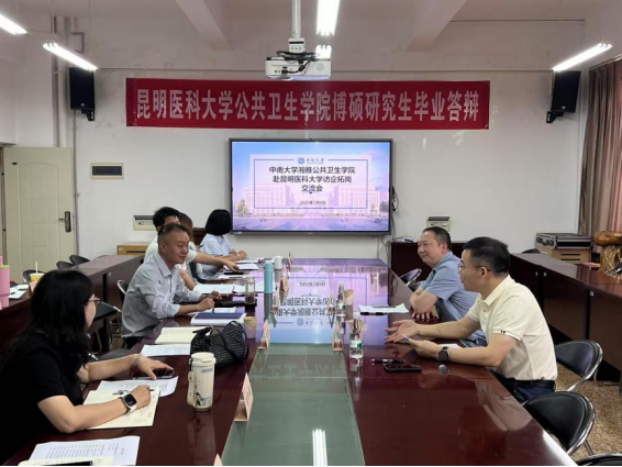 在昆明医科大学公共卫生学院,学院党委书记蔡乐,学院党委副书记、副院长秦家碧等领导对雷书记一行的到来表示热烈欢迎。双方从标志性成果、师资队伍、人才培养、科学研究、社会服务和国际交流与合作等方面互相介绍了两个学院的基本情况,并就学科建设、学院基层党建、学科竞赛等工作开展了专门的交流探讨。