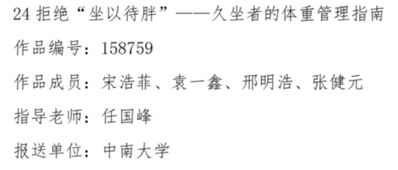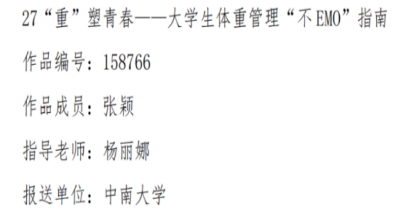此外,作品《拒绝“坐以待胖”——久坐者的体重管理》(作品成员:宋浩菲、袁一鑫、邢明浩、张健元;指导老师:任国峰)、《“重”塑青春——大学生体重管理“不 EMO”指南》(作品成员:张颖;指导老师:杨丽娜)在此次征集活动中获图文类优秀作品。