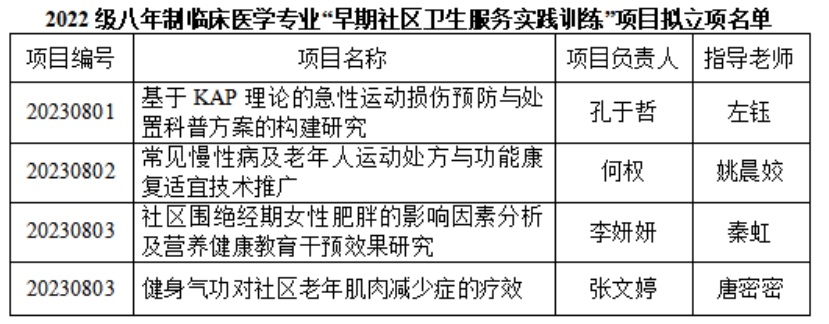 按照《关于2022级八年制临床医学专业“早期社区卫生服务实践训练”项目立项申报的通知》要求,探花视频