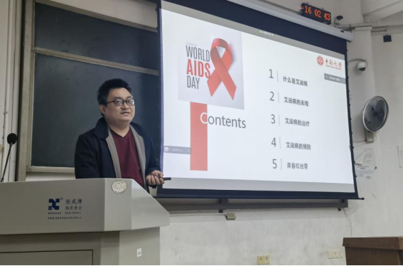 主讲人用艾滋病起源引入话题,讲述了艾滋病病毒的病原学结构及传播途径,其中传播途径主要包括性传播、血液传播和母婴传播。他呼吁同学们注意日常生活中的个人卫生、做到及时消毒,同时还强调日常生活和工作接触不会传播艾滋病,希望同学们树立与艾滋病感染者和谐共处、减少歧视的观念。
