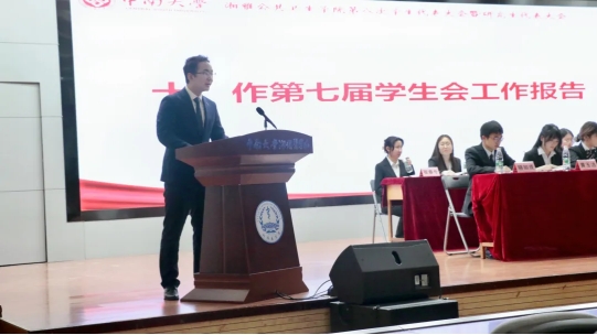 投票结束后,第七届学生会主席团成员蒋志豪、研究生会主席团成员蒋丽芳分别作学生会工作报告和研究生会工作报告。
