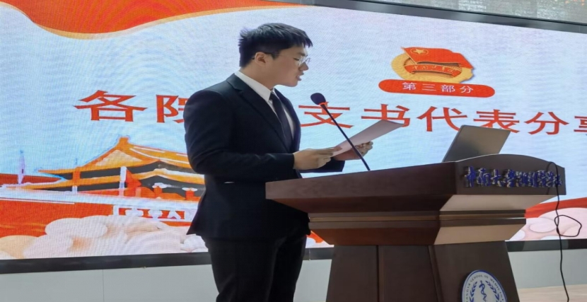经验分享环节的最后,湘雅医学院团委副书记王靖宇上台发言,在演讲中他提到:“新时代中国青年要从党领导下的建团百年历史中汲取精神营养,增强做中国人的志气、骨气和底气。共青团在党的领导下,应不忘初心、牢记使命,走在青年前列,组织引导一代又一代青年坚定信念、紧跟党走,在党的领导下,踏上光荣和梦想的远征。”为各团支书后续如何做好工作指引了方向。