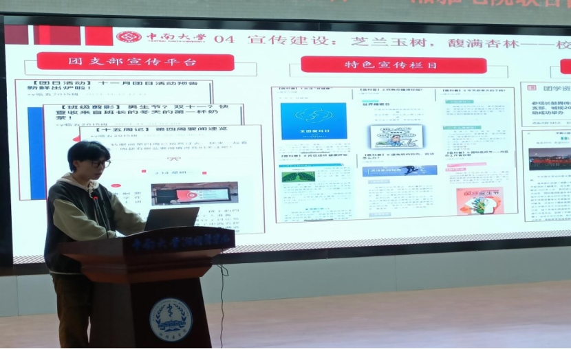 (图为湘雅药学院团支书代表杨奥介绍团支部建设)