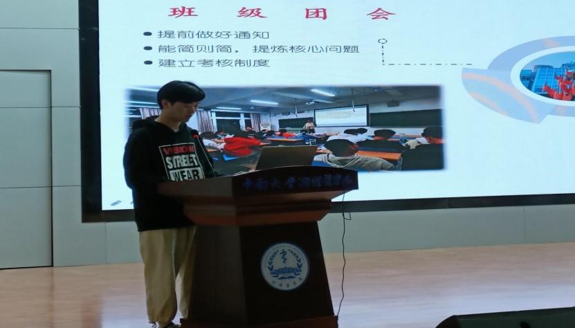 湘雅药学院团支书代表杨奥介绍了团支书的职责并分享了团支部建设与管理的经验。团支书的职责较复杂,杨奥同学依据自己管理团支部的经验,为团支书们详细介绍了工作过程中遇到的问题及相应的解决方案,包含了关注团支部同学思想状况、组织团员大会、组织团日和团课以及推优工作等方面。