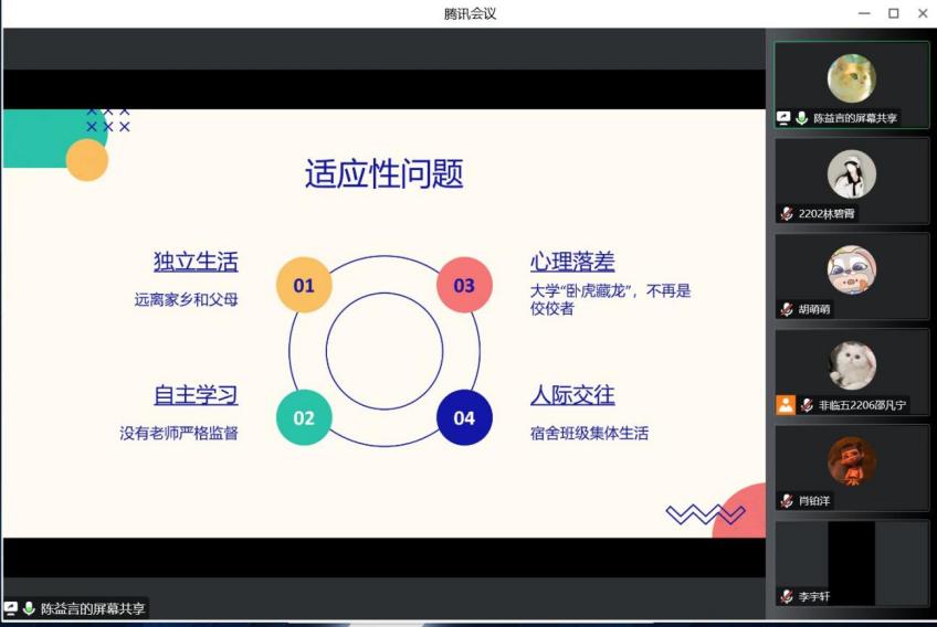 辅导员肖铂洋及2022级全体新生共同参与了此次讲座,本场讲座由非临五2206班邵凡宁同学主持,胡萌萌、陈益言、王思宇、邹苏阳四位2021级同学担任主讲嘉宾。本场讲座的主要目的是解决2022级新生在学习、生活、心理等方面遇到的问题,使同学们以一种积极向上的心态备战期末考试,改进学习方法,处理情绪问题,开拓人际交往,从而更好地适应大学生活。