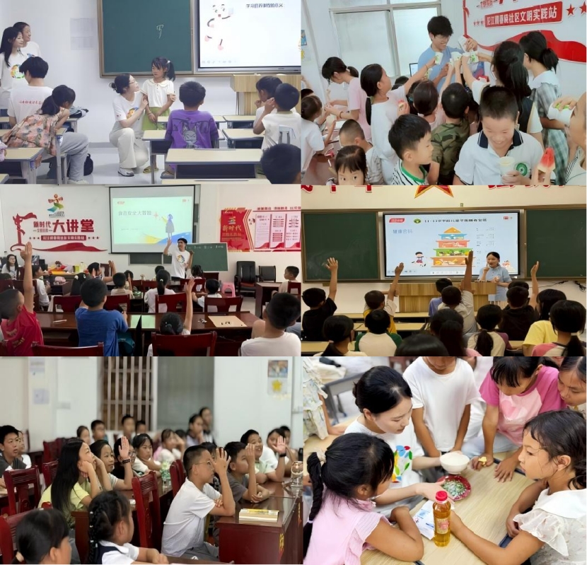 秉持“不能把营养学讲成课本,要让孩子们摸得到、尝得到、记得住”的理念,支教队带孩子们拆解零食包装、解读营养标签,借盐勺和油勺直观展示“隐形盐油”,还现场榨取新鲜西瓜汁,让孩子们在动手实践中感受天然食物。精心设计“破冰之旅”“膳食宝塔拼图”“食品安全小卫士”等互动模块,并结合湖南省“重口味”习惯及“减油减盐”行动,设计相关课程,让孩子成为“家庭健康小助手”,将健康理念带回家,助力乡村饮食习惯向健康转变。