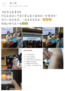 l 积极转发学校学院关于疫苗接种的通知,保证全班同学都可以知道学校疫苗接种的现状,及时参与到疫苗接种工作中。